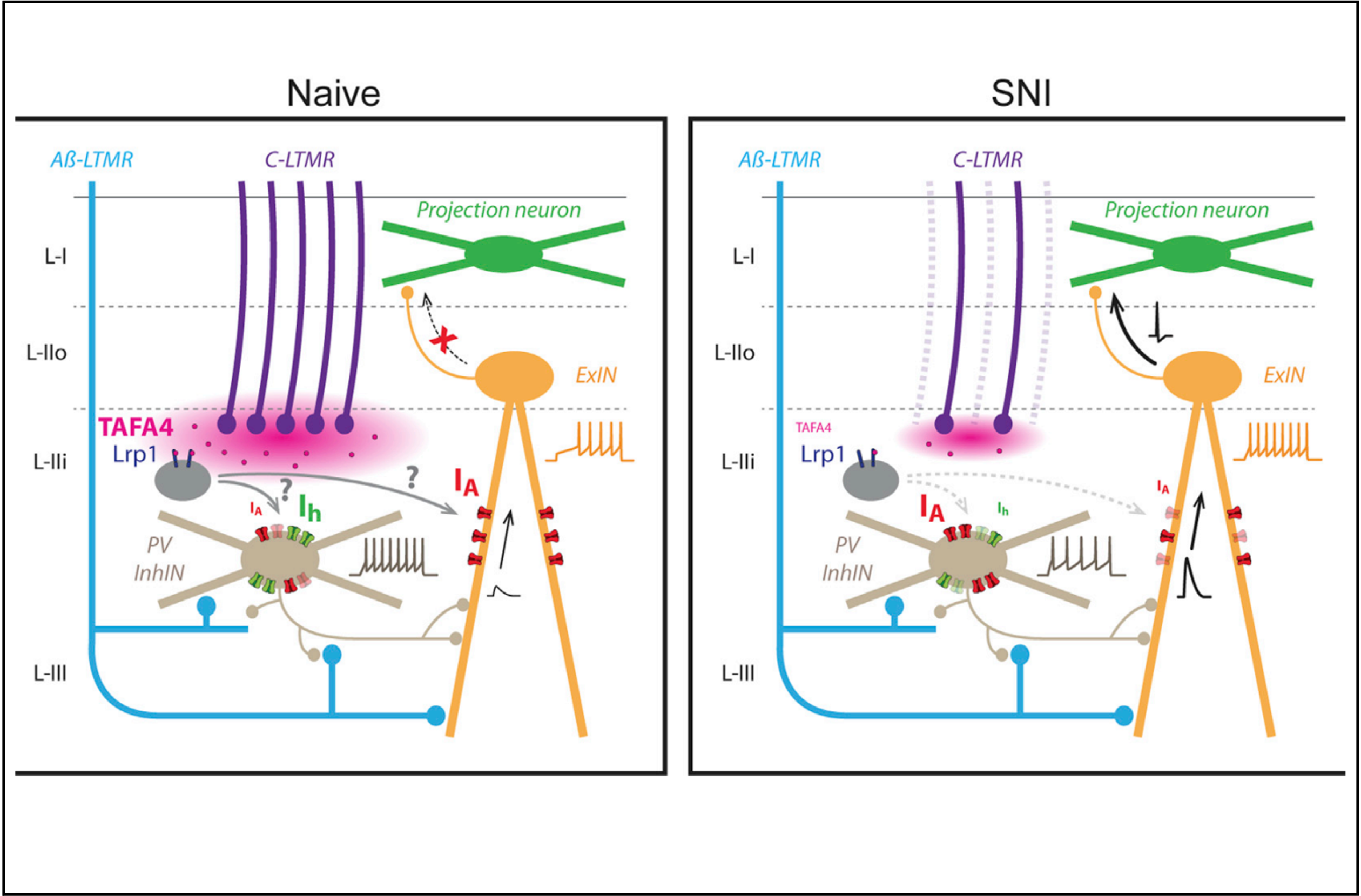 TAFA4 relieves injury-induced mechanical hypersensitivity through LDL receptors and modulation of spinal A-type K+ current