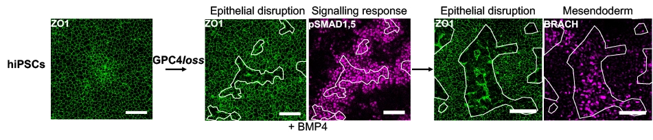 In a study published in Nature Communications led by Rosanna Dono in the Maina team, Thomas Legier, Diane Rattier and colleagues investigated the lineage commitment properties of hiPSCs down-regulated for the morphogen regulator GLYPICAN-4, in which defects in tight junctions (TJs) lead to areas of disrupted epithelial integrity. Using a combination of different hiPSC culture systems, this study shows that cells within disrupted areas become competent to sense the gastrulation signals, BMP4 and ACTIVIN A, and thus differentiate into mesendoderm. Furthermore, a protracted disruption of epithelial integrity sustains activation of the BMP4 and ACTIVIN A signaling pathway over time, affecting the efficiency and robustness of cell fate acquisition.