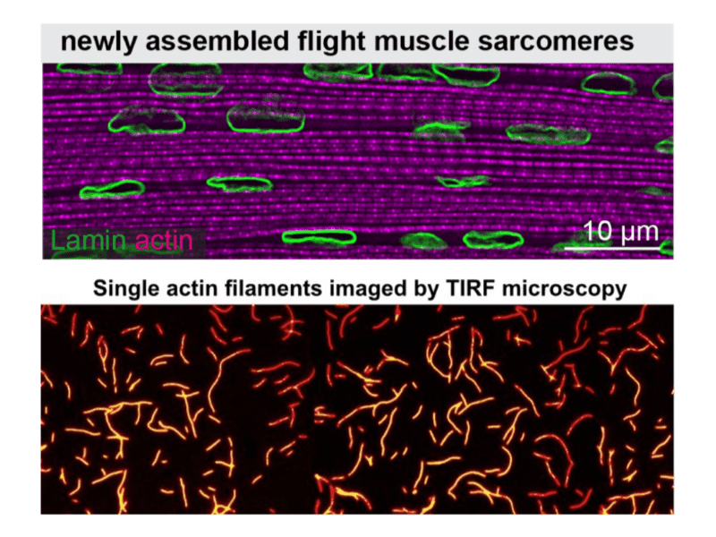 Muscle cells initially contain very dynamic actin filaments and then assemble stable contractile sarcomeres at a defined stage during development. Each sarcomere contains highly ordered actin filaments and is mechanically connected to neighbouring sarcomeres forming long periodic chains (left image). The peptide sequence of muscle actin isoforms present in sarcomeres is highly similar to nonmuscle actin isoforms which are present in the early dynamic filaments. Yet these two actin isoforms have different biochemical properties. Here, we would like to study the mechanism by which molecular differences in actin isoforms lead to a dramatic shift in actin organization and dynamics in muscle cells. We aim to combine Drosophila genetics and in vivo imaging with actin biochemistry and in vitro actin assembly imaging to understand how the molecular choreography of the components drives sarcomere assembly in muscles.