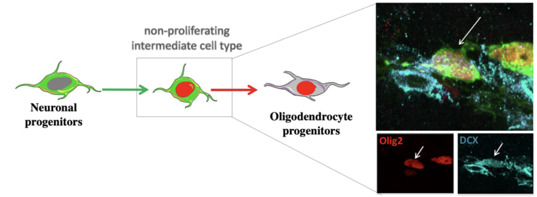 Neuroblasts can generate myelinating oligodendrocytes in pathological states.