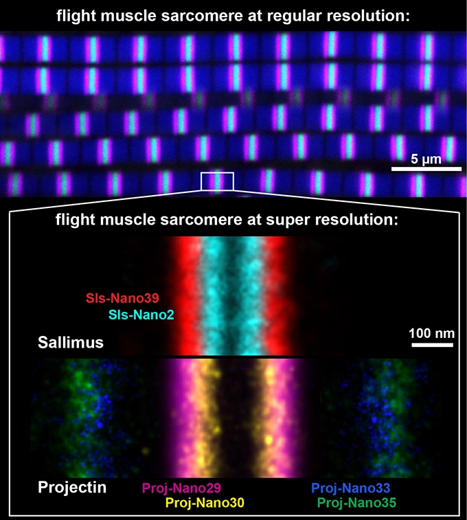 Drosophila sarcomeres visualised at super-resolution with the help of nanobodies and single molecule blinks.