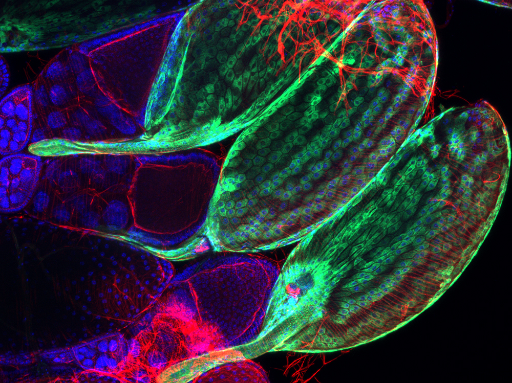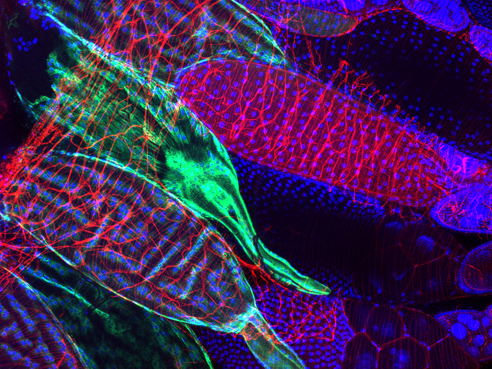 Julien Royet’s team uses the genetic tools generated in the fruit fly to dissect the molecular interactions between bacteria and the host’s nervous system. In an article whose main authors are Ambra Masuzzo and Léopold Kurz, the team demonstrates that the direct detection of a bacterial wall component called peptidoglycan, by only two octopaminergic neurons out of the approximately 100,000 contained in the fly’s brain, is sufficient to modify the behaviour of infected female. By inhibiting the activity of these two neurons, peptidoglycan reduces egg deposition by infected flies, allowing them to allocate more energy to pathogen elimination.