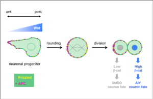 We address these questions using the nematode C. elegans as a model organism. In C. elegans, most neurons are generated during neurulation by asymmetric divisions oriented along the antero-posterior axis. We have shown that these terminal asymmetric divisions are regulated by a particular Wnt/β-catenin pathway. We are now trying to understand :