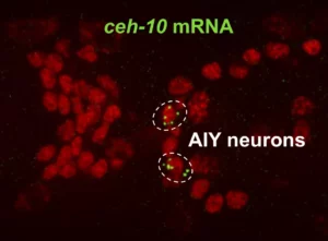 Detection by smFISH of mRNAs for the neuronal transcription factor ttx-3 (green) in a C. elegans embryo.