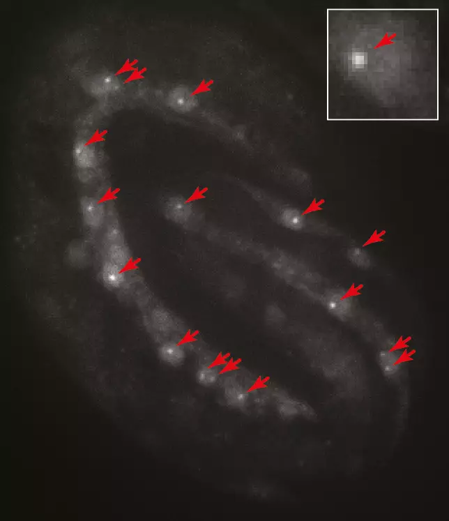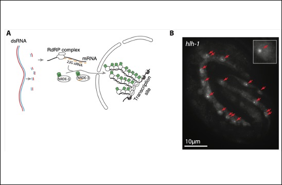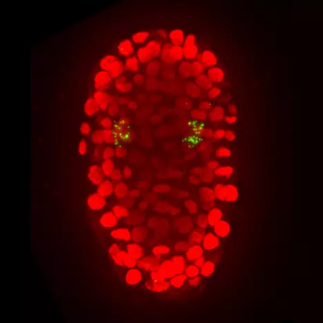 Detection by smFISH of mRNAs for the neuronal transcription factor ttx-3 (green) in a C. elegans embryo.
